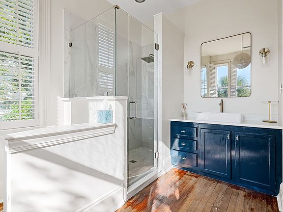 Upstairs, you'll find three inviting bedrooms and three full bathrooms. The primary suite is situated at the front of the home with a queen bed, double doors leading to the second-floor porch, and a beautifully renovated en-suite bathroom with a marble-top vanity, rain-head tile shower, and abundant natural light. The second bedroom features a king bed and desk, while the third bedroom offers a queen bed and private bathroom with a tile shower, double vanity, and access to the laundry area with washer and dryer. A hallway bathroom with a shower/tub combination serves the second bedroom.