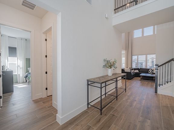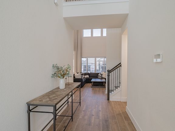 Located in the master-planned community of Esperanza, this stunning 4-bedroom, 3-bath home showcases elegant design and thoughtful details throughout. High-end finishes include quartz countertops, wood-look tile flooring, and stylish wainscoting. An oversized study provides a versatile workspace, complete with a custom two-person built-in desk on one wall and an electric fireplace flanked by built-ins on the other. The open floorplan centers around a chef-inspired kitchen with a large island, gas range with canopy hood, and a convenient pot filler. The space flows seamlessly into the family room, where soaring ceilings and a dramatic floor-to-ceiling tiled fireplace create an impressive focal point. The private primary suite offers a true retreat with a luxury bathroom featuring a soaking tub, separate full shower, and a beautifully designed layout. Custom built-out closets provide both style and function. Additional highlights include a media room with projector and surround sound, and the added convenience of a refrigerator that conveys with the home.