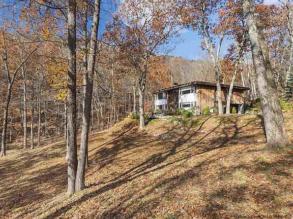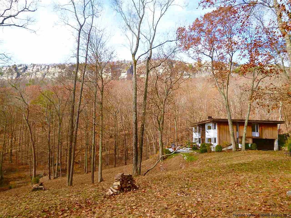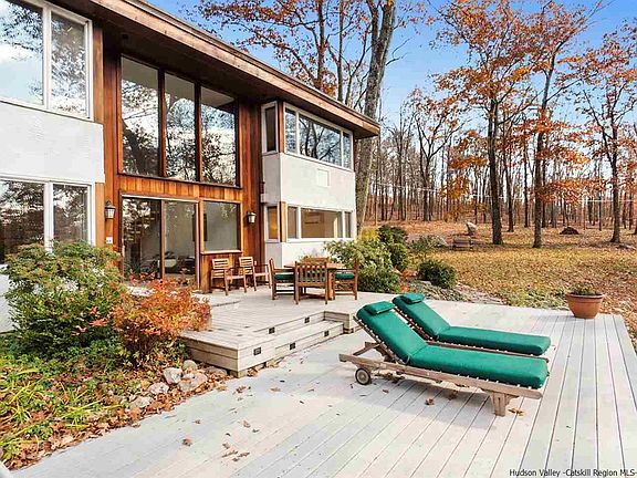 Surrounded by Mohonk Preserve lands, this mid-century beauty possesses the spirit of Frank Lloyd Wright with its tranquil blend of wood, stone and glass. Along with the privacy and tranquil calm of a rushing stream and swimming pond below, there is such a sense of drama created by the Gunks' white cliffs backdrop, visible as you drive in and just a short hike away. Once inside the marble tiled entry, the home's open floor plan welcomes you to the world of light and nature with shimmering views of trees, cliffs and water from all directions. The striking two story stone fireplace brings a natural element to the inside creating balance and connection between the two living levels as well as with nature. Truly a living space that brings the outside in, you will enjoy the peace and serenity both inside and out. Take in the sounds of the rushing stream while enjoying coffee or cocktails from the curved deck tucked behind the house, or watch the wildlife at the pond while sunbathing on the lower deck. Although the flow of the home is open plan, there is still good separation between sleeping and living areas so you will never feel cramped or "on top of each other". In addition to the 3 Bedrooms and Den, there are 3.5 bathrooms, an attached garage PLUS a detached 2 car garage that could be great studio space or a future guest house. The kitchen is well equipped with Thermador and Sub-Zero appliances - a pleasure to cook in. Owners purchased additional acreage to ensure privacy for years to come and although under 5 acres total, this property enjoys the status of adjoining forever wild preserve land. Under 2 hours to NYC and 10 minutes to New Paltz, you can enjoy whatever your Hudson Valley pleasure may be - Rail Trail, Climbing, Hiking, Skydiving, Kayaking, Wineries, Orchards, Breweries, Spa at Mohonk, Shopping and restaurants nearby. Currently making money on AirBNB with a local host, you too could continue to rent when not using the house.