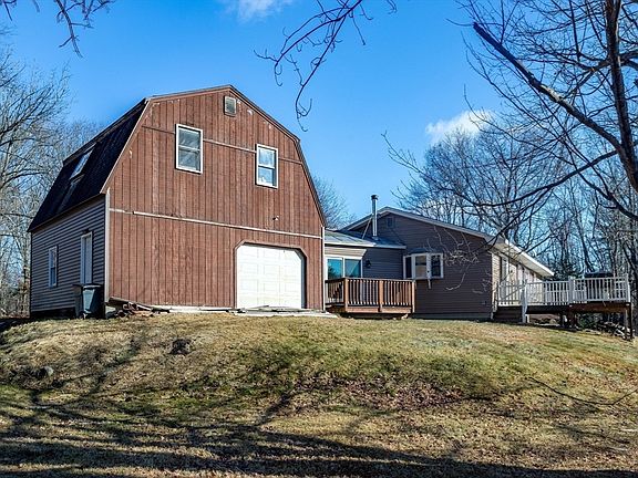 Sprawling ranch located on a peaceful, less traveled road offering endless potential. This home boasts 4 bedrooms, 1 bath, bonus room above garage, charming details like wood ceilings, crown molding, a bay window and a cozy pellet stove to start! A must see! Spacious rooms. The kitchen and dining room each open to separate decks, creating great spaces for entertaining. Bring the outside in!! Enjoy 3 acres of peaceful mother nature! Enjoy morning coffee or afternoon drinks on one of your multiple decks. This home offers the ultimate blend of comfort and seclusion. The heated two car garage includes access to a finished bonus area above, (would be perfect for "man town" or office space), adding extra versatility. Newer furnace and flexible floor plan! Single level /One level living at its best! Come make this home your own!