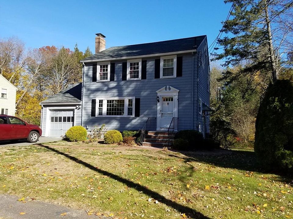 Warm and inviting side entrance colonial in a most convenient location. Seven rooms includes FP living room, formal dining room with corner china cabinet, eat in kitchen, 3 bedrooms, 1 1/2 baths, basement family room and one car garage with double width driveway. Freshly painted in neutral colors throughout. Just refreshed kitchen with granite counters, refrigerator, dishwasher, disposal and counter top microwave. Washer/dryer also included. Enclosed screened porch. Walk to DeFazio Park, train and town center. Easy commute to Legacy Place and University Station. Convenient to 128. Lawn maintenance included.