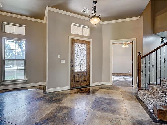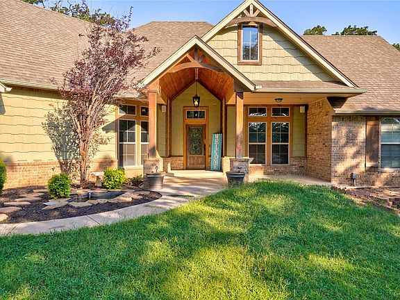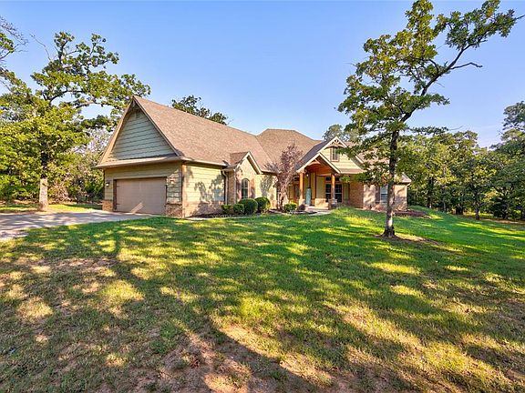 A beautiful retreat nestled on 4 acres offering peace and privacy, this custom-built home, located in a gated neighborhood, is spacious and welcoming with tranquil views from every room. Upon entering the home, you are welcomed into an open floor plan that is inviting and flows beautifully. The oversized windows bring in natural light to the living room, along with a tray ceiling and fireplace. You have the option of a formal dining area or a more casual dining area overlooking the back yard. In addition to a breakfast bar with additional seating there is ample counter space plus a walk-in pantry in the kitchen. Double French doors open into the study with a large closet, making it an excellent 4th bedroom option. The primary suite includes a bath with double vanities, two walk-in closets, soaking tub, and oversized walk-in shower. There are two secondary bedrooms that share a bath. Upstairs is a beautiful theater room with a 120-inch screen and wired for surround sound, as well as a half bath. The entire house is wired for whole house audio, including 6 zones with wall-mounted volume controls. As if it couldn’t get any better, outside you will find that the back patio includes a fireplace, a built-in grill with granite countertop, an entertainment space, and a hot tub. This perfect private oasis also includes TV connections over the fireplace and the hot tub along built-in speakers. Let’s talk shop. The beautifully finished 38x50 shop has a down-draft paint booth for painting cars, separate room for paint, prep and air compressor storage to keep noise down while working in the shop. A steel pipe is run throughout the shop for drop lines for the air compressor. This amazing home is located 20 min. from Tinker AFB, 15 min. to Shawnee, 3 min. to Wes Watkins Lake, and 30 min. to downtown OKC. This peaceful and private property presents the opportunity to own a piece of land that allows for ample space along with the modern comforts in a fantastic location.