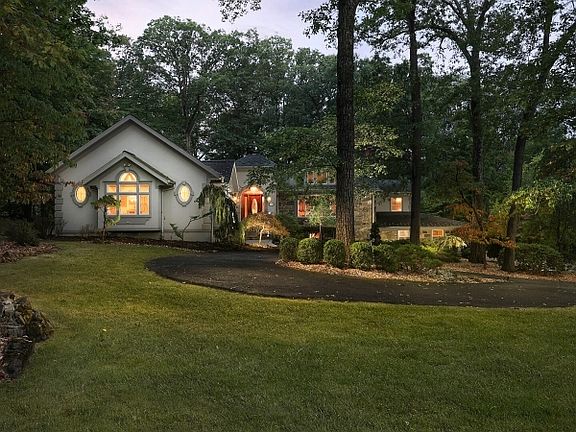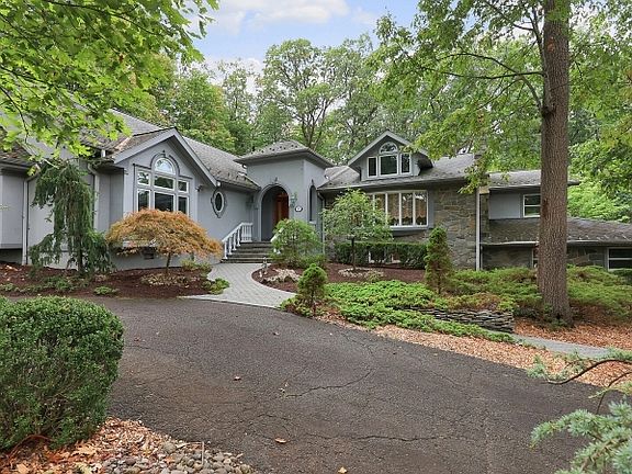 Custom stone and stucco Ranch set on a private wooded lot backing to golf course in the desirable Watchung community. A spacious layout offers multiple living and entertaining areas, blending classic detail with modern comfort. The living room features a stone fireplace, decorative millwork, and access to the formal dining room. The gourmet kitchen includes granite countertops, dual islands, professional-grade stainless steel appliances, and a breakfast area with soaring ceilings and walls of arched windows that fill the space with natural light. The primary suite is designed as a retreat, offering vaulted ceilings, oversized windows, a sitting area, and a private ensuite bath. Additional bedrooms and baths provide flexible accommodations for guests. Unique spaces include a wood-paneled office with built-in wine storage and a finished basement with a second kitchen, additional living space, and storage. Outdoors, the home has a large deck and is surrounded by mature trees, landscaped gardens, and a circular drive. The attached garage provides convenience, while the location offers easy access to shopping, dining, schools, and commuter routes. This home combines privacy, space, and character in a sought-after setting.