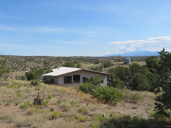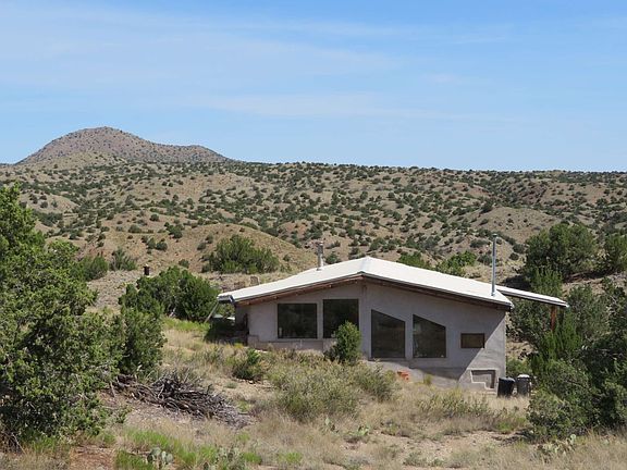 Artist-owned, rustic, off-grid property-- for the intrepid!- offers dramatic cliffs on its North side, and remarkable views from the top. House and separate studio on 15+ acres about 3 miles in off Highway 14 has end of the road privacy (Wolf Rd. is gated). The property backs up to Calle de Meaghan on the cliff side and has a Cerrillos water membership. The home has passive solar design, plank floors, and is nestled/partly bermed into the hillside. Studio includes storage room, bedroom, bath w/ tub. Views of the Ortiz, Sangres, Turquoise Hills, and Galisteo River Basin are truly impressive from this vantage point. No HOA. Sold as is.