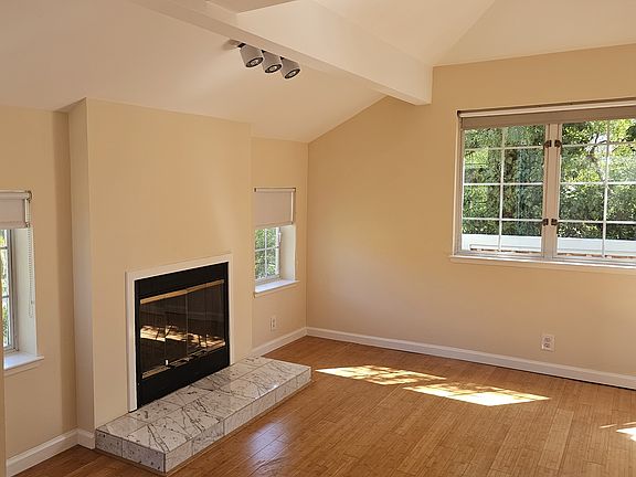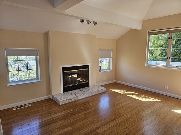 Lovely second-floor unit located behind the main house. This spacious one-bedroom, one-bath apartment features bamboo floors, French doors, abundant windows, and high ceilings with unique architectural details. The remodeled kitchen is bright and functional, offering ample cabinet space, an electric range, refrigerator, and dishwasher. The bedroom also enjoys plenty of natural light and a high ceiling. A walk-through closet with built-in drawers and generous storage connects to the bathroom, which includes a large tub/shower combination.