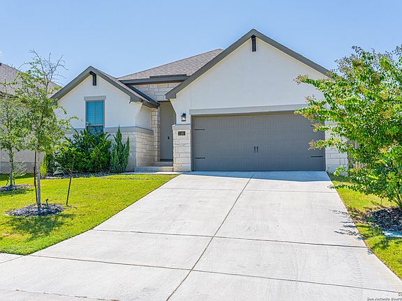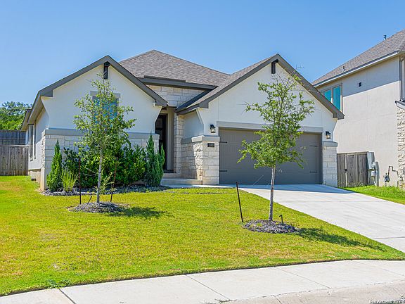 Discover elegance and comfort in this award-winning Monticello Homes, perfectly situated in the sought-after Kinder Ranch community. From the moment you arrive, the beautifully landscaped front yard and no neighbors in front or behind create a sense of privacy and tranquility that's hard to find. Inside, soaring ceilings and tall windows fill the home with natural light, while a separate dining room offers the perfect setting for family meals or formal gatherings. Your spa-like primary suite features upgraded designer tile, a modern soaking tub, and a walk-in shower tiled to the ceiling-a private retreat you'll never want to leave. The gourmet kitchen shines with a stunning quartz island, a large single-basin sink, and an open layout that flows seamlessly into the living area for easy entertaining. Step outside to your spacious covered patio, ideal for year-round enjoyment with peaceful views and no backyard neighbors. Everyday convenience is built in with a mud room, tankless water heater, plumbing for a water softener, a full sprinkler system, and still under the builder 10-year warranty! This home also comes with a newer Frigidaire refrigerator, plus a washer and dryer, making it truly move-in ready. Don't miss this rare Monticello gem. Schedule your private tour today and experience the best of Kinder Ranch living!
