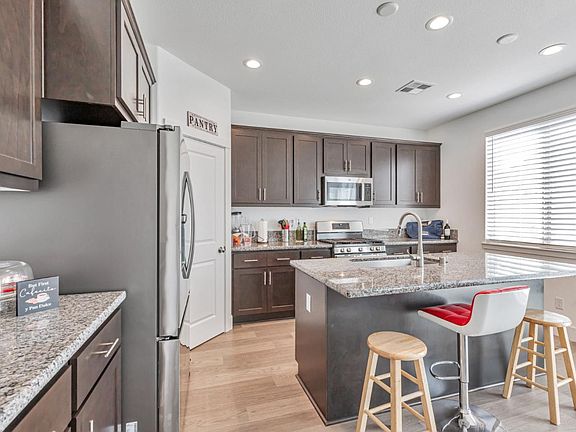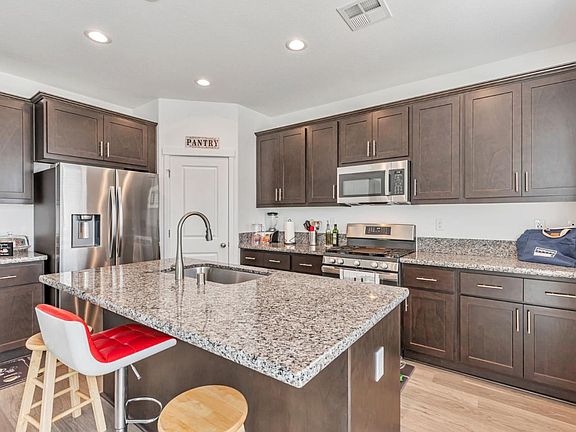 Why wait for new construction? Ready for you to move right in to this beautiful Santana Ranch home located in the delightful city of Hollister! The Ventura floorplan is open with a spacious kitchen and family room which is perfect for those who enjoy entertaining and large family gatherings. The kitchen is a culinary delight featuring ample shaker style cabinets, granite countertops, large island with space for dining and a separate pantry for extra storage. The first floor has beautiful luxury vinyl flooring throughout with carpet and tile upstairs. Additional features include recessed lighting, ceiling fan and window coverings. The refrigerator, washer and dryer are also included. The primary suite has an oversized walk-in closet with double sinks and walk-in shower in the bathroom. Bedrooms two and three are large with an oversized walk-in closet in the second bedroom. This is an energy efficient home with Energy Star appliances and HVAC, tankless water heater and low maintenance landscaping. A neighborhood park is within waking distance plus restaurants and shopping are a short drive away.