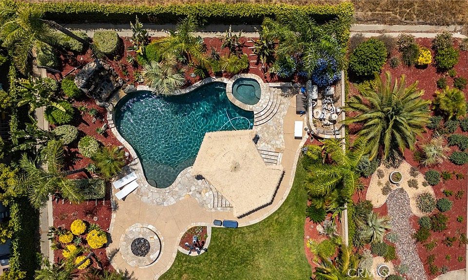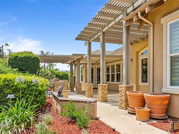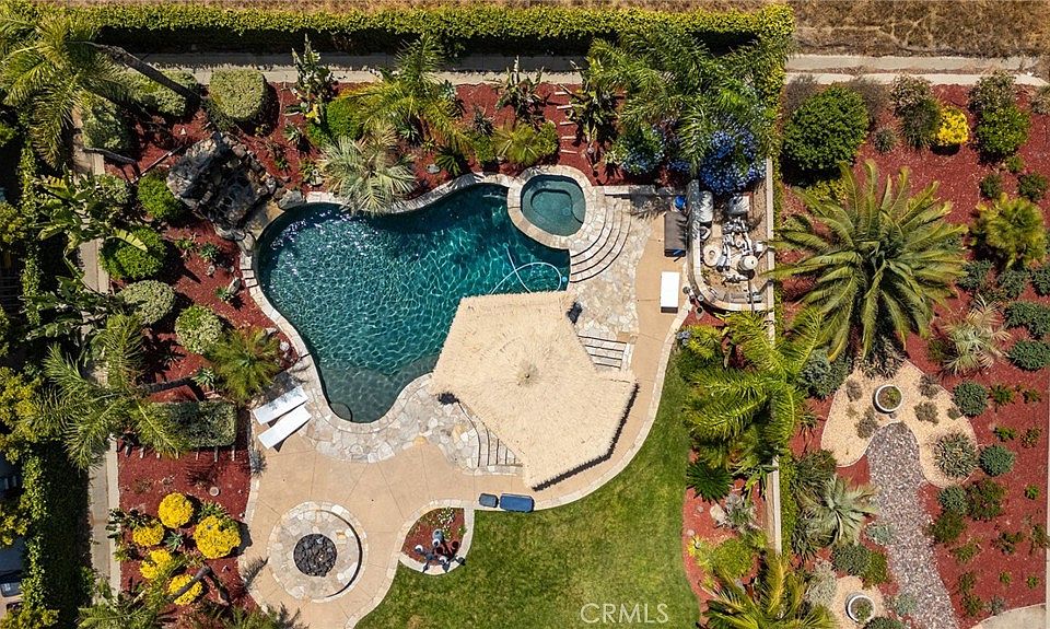 Cleveland Way in South Corona’s single-story offers formerly model home, this maintained property boasts golf courses. The home primary suite with a spa-like bath, double-sided fireplace, and private retreat opening to the patio. All bedrooms furnished with ceiling fans. Kitchen featuring Sub-Zero refrigeration, double ovens, and polished travertine floors. Theater room. Guest suite with private entrance. 24 owned solar panels for energy efficiency. The Ultimate Backyard Escape: Step into your own paradise, designed for entertaining and relaxation: Sparkling pebble-tech salt water pool with a swim-up bar: Handcrafted palapa with thatch roof, built-in BBQ, and premium outdoor kitchen: Raised hot tub, cascading waterfall, and stone firepit: lounge decking surrounded by tropical greenery: RV-friendly side yard (potential for covered parking), also equipped with whole house water softener and alarm system. Prime Corona Living. Walkable greenbelt trails leading to scenic parks. Minutes from The Crossings, Dos Lagos Shopping, and top golf courses (Eagle Glen, Hidden Valley & more) Highly acclaimed schools in a sought-after neighborhood.