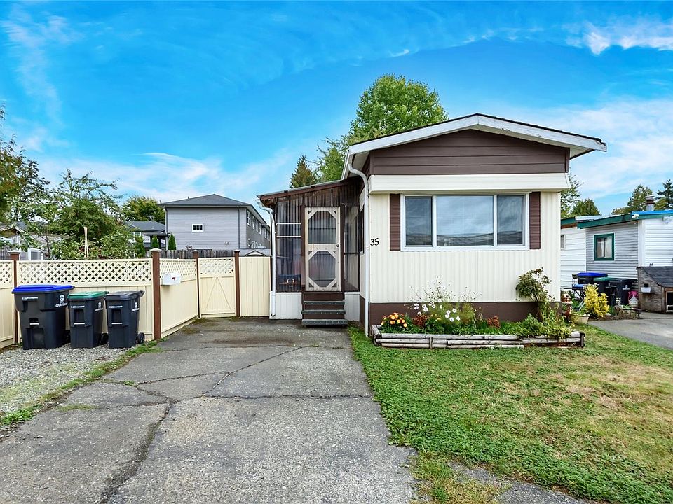 Welcome to this charming manufactured home in the heart of Courtenay! Situated on a spacious corner lot, the largest in the park, this property offers beautiful fruit trees and raised garden beds, perfect for those who love gardening or outdoor living. This home has over 600 sq ft of comfortable living space, this 2-bedroom, 1-bath home is perfect for first-time buyers, downsizers, or investors. The bright, open-concept kitchen and living area create a warm and inviting atmosphere, ideal for everyday living and entertaining. Enjoy the added convenience of an enclosed entry porch—perfect for extra storage or a cozy sitting area. Centrally located close to shopping, restaurants, and recreation, this affordable home provides an excellent opportunity to own in a desirable area. Don’t miss your chance to make this great starter home your own!