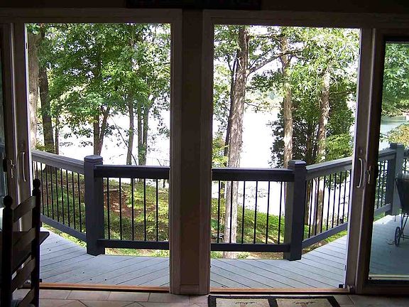 Waterfront 3BD/2BA home with covered dock and one of the best views and deepest water on the lake. This impeccably maintained 2400SF home is located 3 minutes from I85 and the main level features: open kitchen with Corian counter tops and tile floor, large master bedroom, living room with gas log fireplace, deck and huge sun room both with panoramic year-round lake views, laundry chute, additional bedroom, and office/den. The lower level opens to a huge screened porch overlooking the lake and has: full bath, laundry, rec room/bedroom with fireplace, and den/office. The dock is a short easy walk and is equipped with electricity, boat lift, composite decking, and has over 45' of water at full pool! Other features include: 250' well, gutter guards, central vac, composite decking, cedar rails, a circular driveway and a handyman's dream over-sized garage with large workshop area. This location makes an ideal residence or vacation home with shopping minutes away and restaurants only minutes away by land or water!