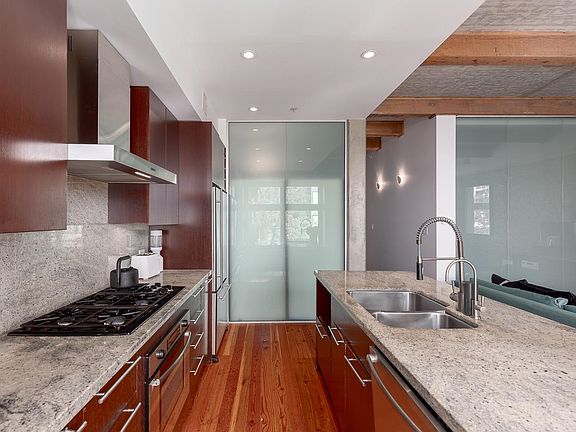 Reclaimed fir floorsGourmet kitchenGranite countersPremium stainless steel appliancesGas rangeFrosted glass accentsPrimary ensuite