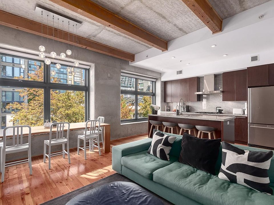 Experience loft living at the McMaster, a boutique heritage conversion by Townline Homes set in the heart of Yaletown. This 2-bed/2-bath residence combines character and comfort with reclaimed fir floors, exposed brick and concrete, and soaring 10-foot ceilings. A gourmet kitchen with an island, granite counters, and premium stainless steel appliances, including a gas range, makes entertaining effortless. The generous floor plan offers frosted glass accents and a primary ensuite designed for relaxation. Central heating and AC provide year-round comfort, while thoughtful storage solutions and secure parking add everyday convenience. With only 15 homes in the building, this is a rare opportunity to own a piece of Vancouver’s architectural history reimagined for modern living. OH Oct 5 2:30-4