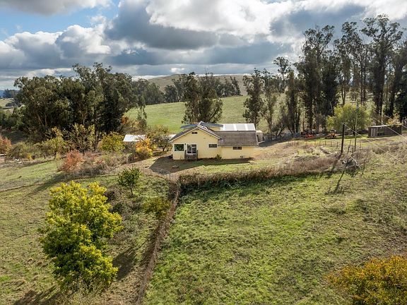 Nestled on 11.75 acres of picturesque rolling pastures & serene valleys, this country farmhouse captures panoramic views of the mountains & city lights. The 4-bedroom, 1.5-bath home features an open-concept layout with large picture windows. The main living areas feature Tan Oak hardwood floors, & the partially remodeled kitchen includes a large island & a classic farmhouse sink. The living room & dining areas are ideal for gatherings, with convenient access to the primary & secondary bedrooms. The built-in desks & dressers in the upstairs bedrooms add a vintage touch. Outdoors, the property provides numerous amenities. A 48'x30' shop with 6'' concrete floors, and a 14' wide insulated power garage door. The original ranch barn includes hangers, hay storage, a corral, & a nearby chicken house. Nature enthusiasts will appreciate the cherry, plum, peach, pear, & apple trees, as well as the newly planted lemon, orange, & lime trees in the front yard. Mature walnut, pomegranate, & persimmon trees contribute to the richness of this property. A 3,000-gal water tank with a pressure pump supports the property's agricultural potential. With the possibility of splitting into 3 parcels, this exceptional property offers both investment and lifestyle opportunities, all just minutes from town.