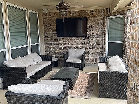 Cedar fenceGenerous size backyardWood floorsStone and brick elevationLarge covered patioStainless steel appliancesBuilt in speakers