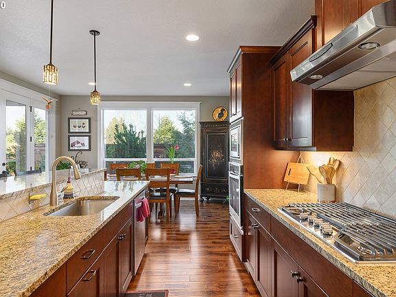 Sensational home with large entertainers kitchen open to the living room with a stately floor to ceiling fireplace.Quiet close cabinets, luxury wood laminate and tile flooring throughout. Large bonus room with wet bar. Backyard has a covered patio for year round BBQs. Easy to maintain landscaping with seasonal flowers and manicured trees. Sit out and enjoy the bird haven. Backs up to tree farm, fully fenced, dog run with access to the 4 car garage. RV parking and tool sheds.Easy to show!
