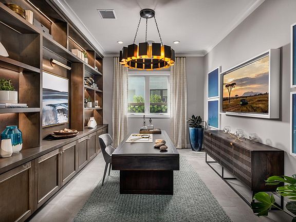 Stylish contemporary living. The Coast's welcoming covered entry flows into the impressive two-story foyer, revealing the expansive great room, dining room, and views to the desirable luxury outdoor living space beyond. The well-designed gourmet kitchen is equipped with a large center island with breakfast bar, plenty of counter and cabinet space, and ample walk-in pantry. The stunning primary bedroom suite is highlighted by an enormous walk-in closet and deluxe primary bath with dual-sink vanity, large soaking tub, luxe shower with seat, and private water closet. Sizable secondary bedrooms are central to a generous loft, and feature walk-in closets and private baths. Additional highlights include a desirable first floor bedroom suite with walk-in closet and private bath, versatile office off the foyer, convenient powder room and drop zone, centrally located laundry, and additional storage.