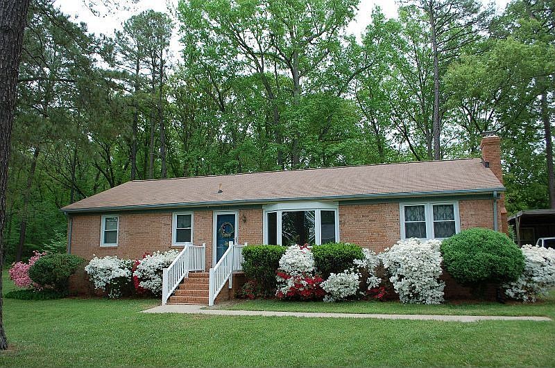 Country Living but Close to Everything! Sit on your oversized screened porch with ceiling fan, grill out on the deck and enjoy 1.38 acres of quiet and privacy. The one-of-a-kind yard features perennials, unique tree specimens including a gorgeous blue spruce, and trails through your own private woods. Two BR, 2.5 bath brick rancher on cul-de-sac with vinyl replacement windows and trim and new vinyl porch railings make for low maintenance! The large eat-in kitchen with pantry looks out onto the lush back yard. Features include two family rooms, stained glass, ornate wood stove, hardwood, ceiling fans, Jacuzzi tub, extra-large laundry/mudroom with room for office or craft space. Double carport attached to shed with paved driveway with room for multi-vehicle parking.