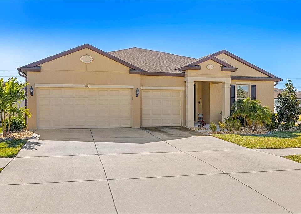 Explore the allure of this newer 4-bedroom/3-bathroom/3-car garage home in beautiful Summerset at South Fork. This 2019 built spacious home sits on a corner lot. The inviting single-story floor plan features a modern color paint scheme and includes formal living and dining rooms, roomy family room, luxurious gourmet kitchen w/white cabinets, stainless steel appliances, granite countertops, large island, walk-in pantry, cooktop, tile backsplash and range hood, breakfast nook w/room for a large table, generously sized primary bedroom with his/hers closets, oversized primary bathroom w/dual sinks, large shower and water closet. The split floor plan finds 3 additional bedrooms and 2 additional bathrooms on the other side of the home. Bedroom-4 would make an ideal in-law suite w/its very own En-suite bathroom (bath-3). This home also features a beautiful 20x16 screened lanai ideal for enjoying the outdoors. Some other extras include a generously sized laundry room (washer/dryer included), water softener, ring doorbell, irrigation system and two garage door openers. South Fork is ideally located near shopping, restaurants, schools and the interstate. The South Fork III community center is nearby where residents enjoy the large resort style pool, playground and basketball courts.