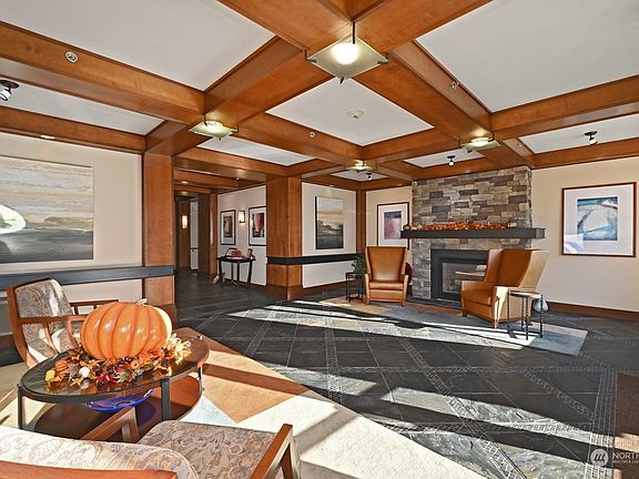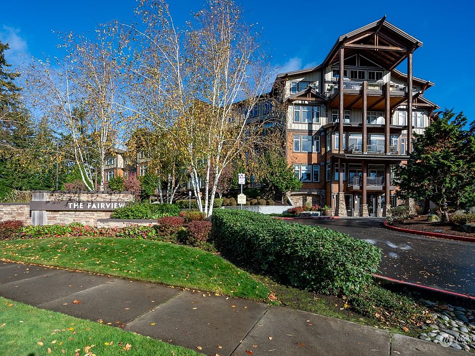 Experience elevated living in the Augusta at The Fairview, a 1-bed plus large den, 1.5-bath resort style condo! Soaring 10' ceilings, extra large windows bring in natural light, new carpet & laminate wood floors, SS Kitchen, a Kozy Heat gas fireplace, dual patio sliders to viewing deck plumbed for gas BBQ & more! Enjoy in unit partial views of the Sound and the lush greens of the nearby golf course. Located in a secure building, this unit includes 2 dedicated garage parking spaces & private storage room. Enjoy a well-equipped exercise & clubhouse w/ cable TV's & more. Unwind in the serene courtyard, BBQ grill station, beautiful gardens & golf course views. This bright, stylish home is ready to welcome you home! Seller is licensed WA Broker.