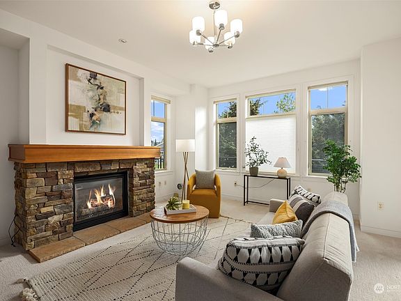 Fairview Condo-Home features an open concept 2 bdrm 1.75 bath Lvg & Dng Rm w/high ceiling, large windows w/natural light, kitchen w/hardwood floor, granite/quartz counters, eating bar, SS appliances, newer microwave/convection oven. 4-yr-old carpet & paint. Lvg rm w/gas fireplace, sliding doors lead to 2 balconies-1 from Lvg Rm (covered) & 1 from Prim bdrm w/Harbour Pointe Golf Glub view, custom walk-in closet in Prim bdrm & laundry rm, flex space/office. Secure lobby entry, common garage (1 space #79) & 2 storage cupboards. Amenities-clubhouse, exercise rm, courtyard w/built-in BBQ/entertaining space. Excellent location, close to library, parks, beach, shops, schools, Boeing plant, Paine Field Airport, & freeway access. Elevator no stairs.