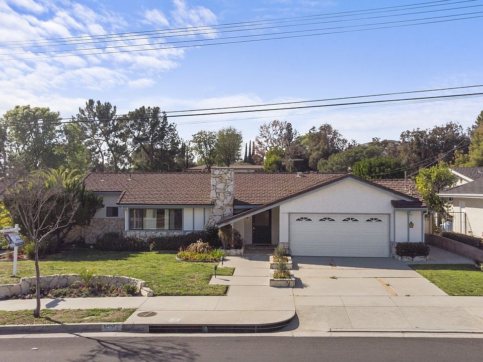 Residing in desirable Granada Hills is a wonderfully spacious 3-bedroom, 3-bathroom, 2,348-sqft single story home with attached 2-car garage! A neatly manicure from yard leads into a large formal living room complete with a ranch style fireplace, shuttered windows, and carpeting though out the common spaces. Towards to large living room, find a comfortable living space featuring access to a full bathroom, vintage paneled walls, a wet bar with bar top, and sliding doors access to the expansive backyard. Through a large dining is a charming kitchen where the built-in cabinetry is abundant, all built-in appliances, classic tile counters, room for a breakfast nook, and a fun breakfast bar that's perfect to set up a couple of highchairs. Each bedroom includes large built-in closets and nice window coverage while the primary bedroom suite features two closets with mirrored sliding doors, a vanity space with overhead pendant lighting, separate outdoor access from sliding glass doors, and an en-suite bathroom with a dual sink vanity. Outside is a marvelous entertaining spot from the open lounge/patio space to the glittering in-ground pool, an idyllic oasis to enjoy. Minutes from Trader Joe's, Target, HomesGoods, local schools, parks, easy freeway access, and more!