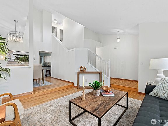 Beautiful home in a peaceful setting with 3 bedrooms and 2.5 bathrooms upstairs, and all the living spaces on the main level. A circular floor plan and a dramatic open staircase to the upstairs. Just refinished hardwood floors throughout the main level, a vaulted ceiling and a bay window in the living room. The chef's kitchen includes an island, stainless steel appliances, a gas stove, and granite counters. The kitchen is adjacent to the family room, and overlooks the level rear yard. A spacious primary suite with a walk-in closet, soaking tub, and separate shower. Three-car garage! Non-thru street so very little traffic. Excellent Kent location.