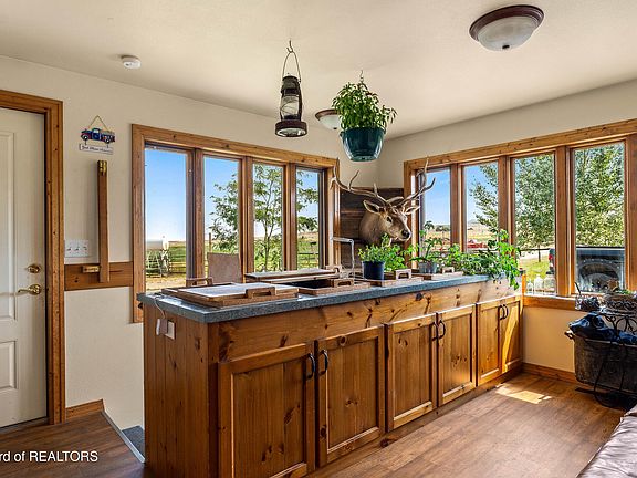 This classic 1958 brick ranch-style home offers 1,665 sq ft of comfortable living on a beautiful 125-acre property. The home is framed by mature landscaping, a lush garden area, and stunning Wyoming views.
