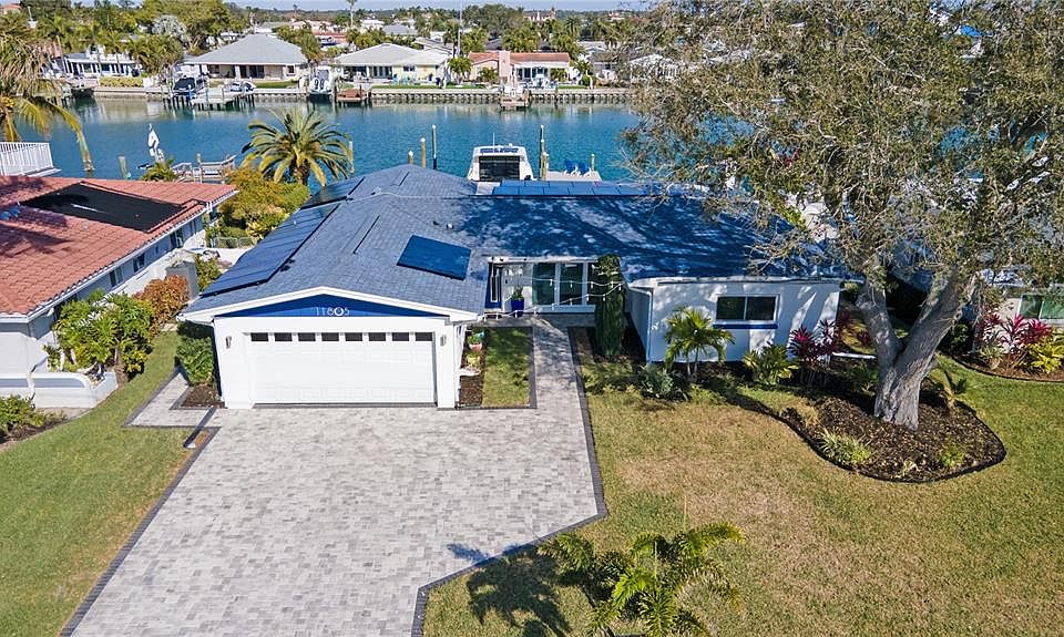 Isle of Capri, Treasure Island's premier boating community, is coastal living at its best. Only minutes by boat to Johns Pass and the stunning waters of the Gulf of Mexico, this 1943 sq. ft., 3 bedroom, 2 bath, 2 car garage residence has been renovated and updated over the last few years to reflect a modern feel. Clean curb appeal with a beautiful Live Oak shading the front yard. New brick paved entryways and driveway. Inside you will have an open floor plan with beautiful water views, original Terrazzo floors and plenty of light . Fully restored fireplace in the family area provides warmth on those colder evenings. The renovated kitchen boasts soft close cabinets, quartz countertops, glass backsplash and a wine fridge. The owner’s area features a well organized closet and remodeled bathroom. Off the living area are two bedrooms, and a guest bath with dual sinks, a bathtub and enclosed shower. This house was remodeled in 2020/21 with new plumbing, electrical, roof, exterior stucco and paint, impact windows and doors, interior doors, bathrooms and kitchen. The pool was installed in 2021 and a new 70 foot seawall was installed in 2022. The mooring pilings with deep sailboat water and the Tide-Slide mooring system were installed in 2020 and can accomodate a 50 x 25 vessel. The dock includes 50/30/20 amp service and has running water. The residence boasts a whole house water softening system, on-demand water heater and has 41 rooftop solar panels along with a Level 2 EV charger that was installed in 2022. Just a golf cart drive to the beach, shopping, dining and only 40 mins from the Tampa airport.