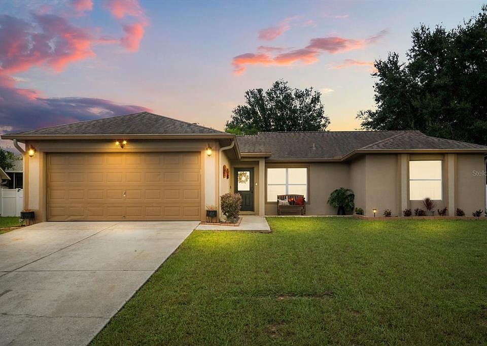 Located in the highly desired Spring Valley community, this beautifully updated modern home features Corian kitchen countertops, top-of-the-line stainless steel appliances, and upgraded lighting and features tile plank flooring throughout. Both bathrooms have been fully renovated with modern finishes, and the primary suite includes a walk-in closet and an en suite bath with dual sinks. Additional updates include fresh interior paint, a two-car garage, and a fully landscaped yard. The backyard is designed for relaxing and entertaining, complete with a covered screened patio and an above-ground pool with a swim spa. A welcoming front porch adds charm and curb appeal. The split-bedroom layout, combined with spacious living, dining, and family areas, creates an easy flow that feels both comfortable and well-appointed Located minutes from the Clermont chain of lakes, parks, shopping, dining, and medical facilities—with easy access to Hwy 27 and Hwy 50—this home offers an unbeatable location for enjoying Central Florida living.