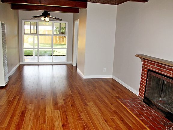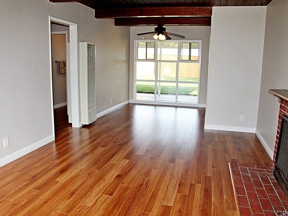 Attention First time buyers! At the end of this quiet cul-de-sac you will find this beautifully restored 2 bedroom + 1 bath home. This property boasts great curb appeal with brand new exterior paint, professionally landscaped with sod and covered front porch. Inside you will find an inviting living room and dining room with brick fireplace, beamed ceiling and floor to ceiling picture windows allowing ample light. All new interior paint with decorator colors and brand new engineered wood flooring throughout the entire house. Both bedrooms are generous in size and have wood beamed ceilings. The hall bath has been redone with new flooring, new vanity and sink, newly tiled shower and new window with privacy glass. The kitchen has been updated with white ceramic tile counters, gas stove and crisp white cabinets with new stainless pulls. Included is a new Bosch dishwasher and refrigerator. 2 new wall AC units! The large backyard allows room for expansion or simply enjoy the covered patio and large yard with new wood fencing. 1 car attached garage with direct access. Excellent value and nothing to do but move in.