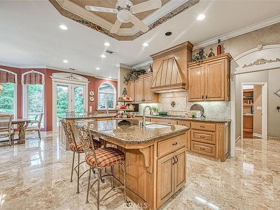 The primary suite serves as a private retreat, boasting a beautiful custom ceiling, marble floors, and French doors that open directly to the patio, seamlessly connecting indoor and outdoor living.