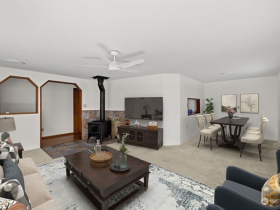 PRICED TO SELL! Welcome to this beautifully cared for 3-bedroom, 1.5-bathroom manufactured home in Lake Stevens. Freshly updated with new carpet and paint, it’s move-in ready and full of charm. Handmade details throughout. Naturally bright interiors feature engineered hardwood floors, cozy carpeting, and a wood-burning stove in the living room. A generous deck provides the perfect area for outdoor gatherings, with towering trees and a peaceful backdrop. The 10,454 sq ft lot offers ample parking and even space for a garden or greenhouse. A detached shop with a power car lift adds endless potential for storage or projects. Note: Photos are virtually staged.