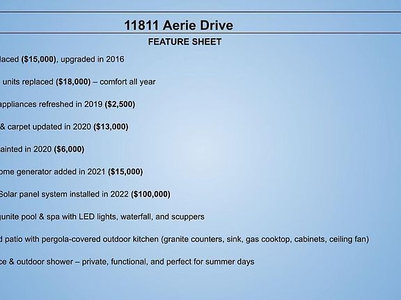 Welcome to this inviting two-story home with 4 bedrooms and 3.5 baths, where open spaces and high ceilings create a bright, airy feel. The living room features a cozy fireplace, and the dining area flows into the kitchen with a breakfast bar, tile backsplash, and modern appliances. Upstairs, a large game room and spacious primary suite with dual sinks, garden tub, and separate shower offer comfort and convenience.Thoughtful updates include new flooring, full roof replacement, both A/C units, a whole-home generator, and a solar panel system for energy efficiency.The backyard is an entertainer’s dream—featuring a heated pool and spa with LED lighting, waterfall, and scuppers. The extended patio leads to a pergola-covered outdoor kitchen with granite counters, sink, and plenty of storage. With an outdoor shower, new fencing, and lush design, this private oasis is perfect for relaxing or hosting. Blending modern upgrades with timeless comfort, this home is move-in ready.