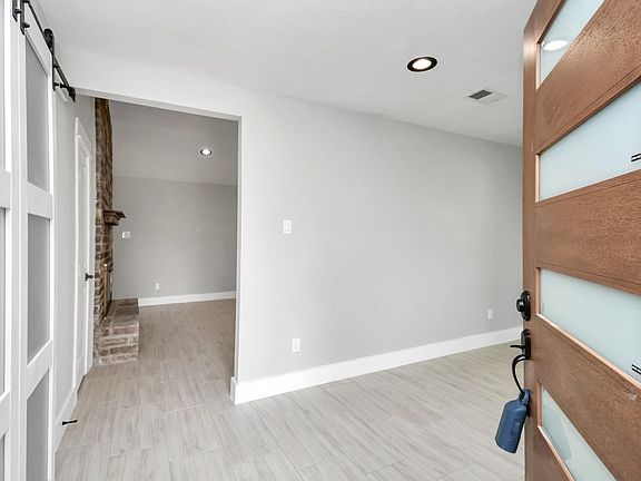 Inside, you’ll find an open and airy floor plan with fresh neutral paint, sleek tile flooring, and abundant natural light. The kitchen is a showstopper with custom wood cabinetry, quartz countertops, stainless steel appliances, and a gas range—perfect for any home chef. A sliding barn door adds character and leads into a spacious living area ideal for entertaining or relaxing.