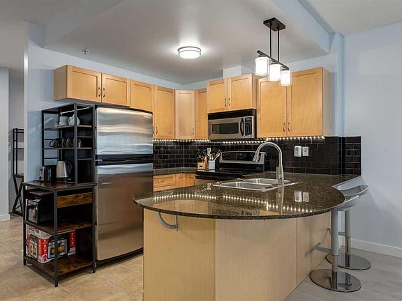 LIVE IN THE AWARD-WINNING CALGARY CONDO OF THE YEAR 2025! Welcome to Gateway Southcentre, where luxury meets convenience. This expansive 1-bedroom plus den unit offers nearly 700 sq ft of functional living space, freshly updated with modern laminate flooring and paint throughout. The bright, open-concept layout features a kitchen equipped with timeless maple cabinetry, stainless steel appliances, and quartz countertops with a breakfast bar. The living area extends naturally to the patio, perfect for summer BBQs. PET OWNERS WILL LOVE THIS LOCATION as the main-floor unit provides direct access from your patio to the sidewalk, making morning walks effortless. The primary bedroom is generously scaled with a walk-in closet, complemented by a 4-piece bath and a dedicated den ideal for a home office. Complete with in-suite laundry, titled underground parking, and an assigned storage area. The building offers efficient geothermal heating and cooling alongside premium amenities including a fitness center, guest suites, party room, and underground visitor parking. Located within walking distance to the trendy shops and restaurants in Avenida, Southcentre Mall and with easy access to major roads, this property is a must-see.