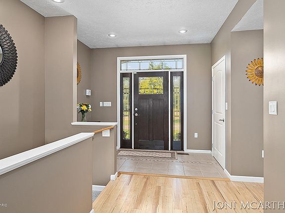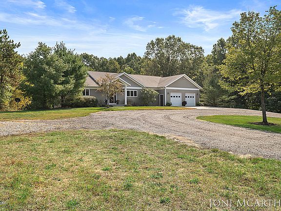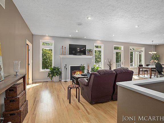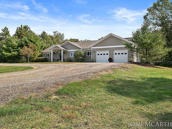 Located on almost 7 acres in award winning Lowell School District you will find this gorgeous sprawling Ranch. As you enter the front door, you have that open concept feeling that spotlights the fireplace in the living room and a wall of windows overlooking the private backyard. Natural light is abundant throughout this entire home. Living room is open to the kitchen and dining room. The Kitchen has storage galore, a walk-in pantry, a center island as well as a sit up bar to sip your coffee or enjoy your evening cocktail. Also on the main floor is the master ensuite and walk-in closet. The shower alone in the master will wow you! Off the living room is a quiet sunroom/sitting room that would be perfect for reading or make a wonderful main floor office. Another bedroom, full bath, half bath, deck off the dining room and main floor laundry completes the first floor. Downstairs is a walkout and features a locked safe room, another bedroom, full bath and huge walk-in closet.