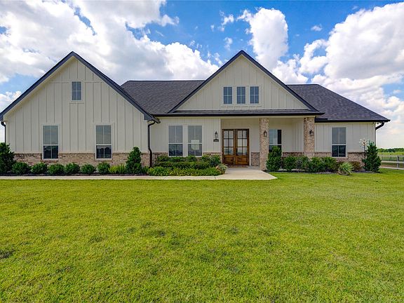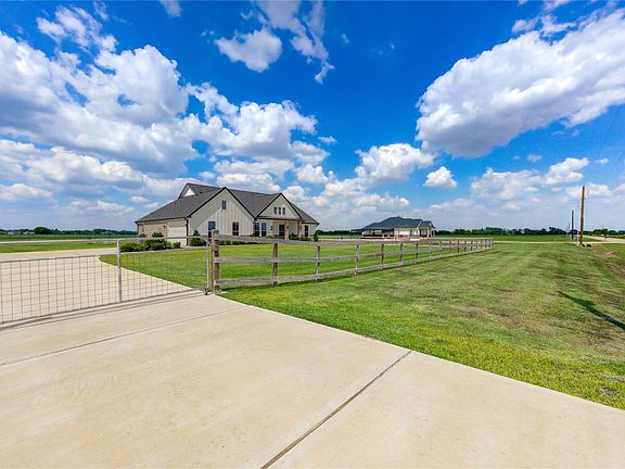 Welcome to this stunning modern farmhouse on over an acre in Needville! Designed with comfort and style in mind, this home features an open layout, high ceilings with beams, and tile wood plank floors throughout. The gourmet kitchen offers quartz countertops, custom cabinetry, stainless steel appliances, a walk-in pantry, and an oversized island perfect for entertaining. The spacious primary suite includes a spa-inspired bath with dual vanities, a jetted soaking tub, and a frameless glass shower. A dedicated study provides flexibility to be used as a 4th bedroom if desired. Enjoy breathtaking sunrises and sunsets from the covered front porch overlooking wide-open views. A 2-car garage provides ample parking and workspace. No HOA—country living with modern luxury in highly rated Needville ISD!