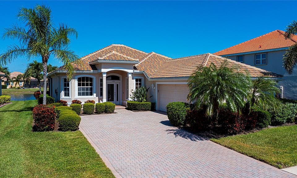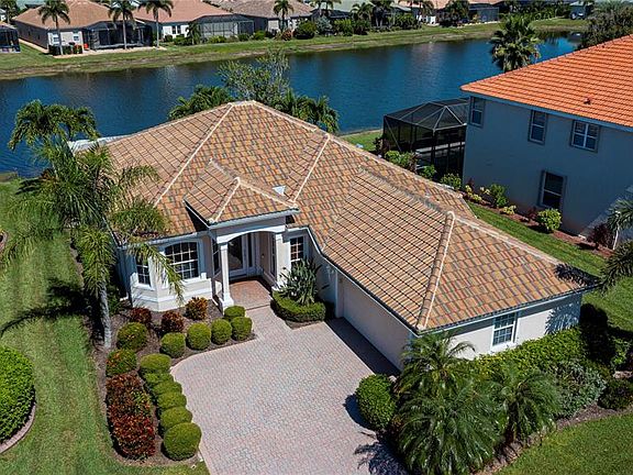 One or more photo(s) has been virtually staged. Now is your opportunity to own this beautifully maintained 2-bedroom, 2-bath home with a den and tranquil pond views in the highly sought-after, guard-gated community of Stoneybrook at Venice. From the moment you arrive, the home’s charming curb appeal stands out — featuring a side-load garage, pavered driveway, and tropical landscaping. Inside, you’ll find high ceilings, plantation shutters on all windows (except the sliders and aquarium-style window, both of which have a protective tint), and tile flooring, creating a bright and open feel. The spacious den, with double-door entry, built-in shelving, and a cozy window bench, makes the perfect home office, library, or hobby room — offering flexibility to suit your lifestyle. The foyer opens to a large great room, where a wall of sliding glass doors leads to the oversized screened lanai overlooking the serene pond — seamlessly blending indoor and outdoor living. The dining area features an aquarium-style window that fills the space with natural light and showcases beautiful water views. The kitchen is sure to impress the chef with ample cabinetry, maple wood finishes, stainless steel appliances, and generous counter space. A large breakfast bar connects to the living area for easy entertaining, while a light-filled breakfast nook is perfect for morning coffee — all while taking in tranquil pond views right from the sink. The primary suite is a peaceful retreat, featuring a vaulted tray ceiling, water views, and a spa-inspired en-suite bathroom with dual vanities, a deep soaking tub, walk-in shower, and private water closet. The spacious walk-in closet offers ample storage and organization. Both bedrooms feature rich walnut luxury vinyl flooring, adding warmth and elegance throughout the home. A private guest bedroom and second full bath are located on the front side of the home, creating the perfect layout for comfort and privacy. The laundry room, located just off the garage, includes a brand-new washer and dryer and additional cabinet storage. The garage also includes a convenient spare sink — ideal for cleanup after gardening or projects. Step outside to your own slice of paradise — the large, covered lanai with screen enclosure offers plenty of space to relax, entertain, and enjoy beautiful views over the pond. The lanai includes roll-down shutters for convenience, while metal hurricane shutters are neatly stored in the garage for peace of mind. Additional upgrades include a new HVAC system (2023) and a new roof (2024) with a 30-year warranty, providing lasting value and reassurance for the new homeowner. Residents of Stoneybrook at Venice enjoy resort-style amenities, including a community pool and spa, tennis and pickleball courts, basketball court, sports field, fitness center, and more. Ideally located near historic downtown Venice, Venice Beach, and the vibrant Wellen Park town center — where you’ll find restaurants, shopping, live music, a weekly farmers market, and a large lake for kayaking and canoeing. With easy access to I-75 and proximity to CoolToday Park, home of the Atlanta Braves spring training, this location truly captures the essence of Florida living. If you’ve been dreaming of your own piece of paradise, don’t wait — schedule your private showing today and experience this move-in-ready gem for yourself!