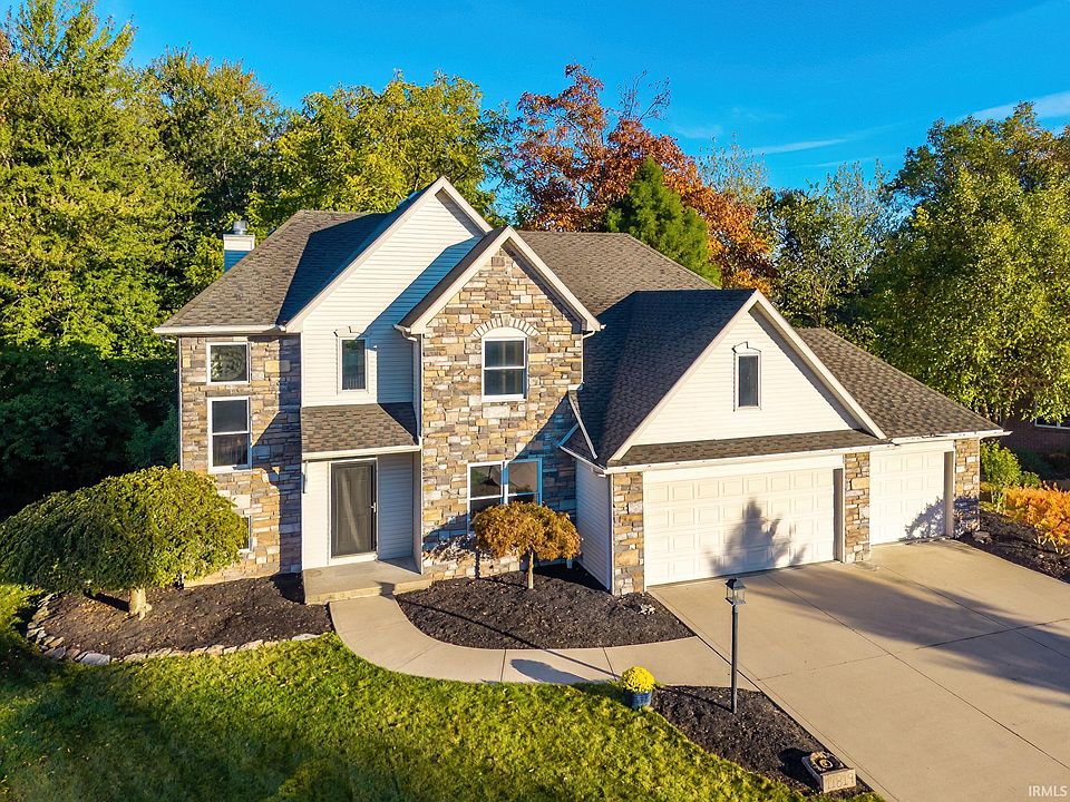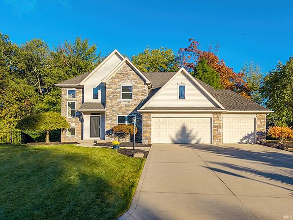 Welcome to this spacious and move-in ready 4-bedroom, 3.5-bath home, ideally situated on a quiet cul-de-sac in the highly sought-after Lakes of Brooks Crossing—a vibrant community known for its friendly neighbors and strong sense of community. Offering 3,170 square feet of finished living space, including a fully finished walk-out lower level, this home perfectly balances comfort, space, and privacy, all just minutes from top-rated Northwest Allen County schools, shopping, dining, medical facilities, and easy I-69 access. The main level welcomes you with a two-story foyer that opens into a dramatic great room featuring a corner gas-log fireplace and sliding glass doors leading to a 12x16 elevated deck. The formal dining area, complete with a recessed hutch niche and elegant chandelier, offers versatility as a classic dining space or a stylish home office. The kitchen boasts porcelain tile flooring, custom cabinetry, stainless steel appliances—including a gas range—a deep sink with a window view, and a convenient corner pantry. Adjacent to the kitchen, the laundry room is equipped with an LG washer and dryer, utility sink and ample storage. A bright bay-windowed eat-in area overlooks the partially wooded backyard, providing serene views and added privacy. Upstairs, three generously sized bedrooms and two full baths await. The owner’s suite impresses with a vaulted ceiling, spacious walk-in closet, and spa-like en suite featuring a jetted tub, separate shower, dual vanities, and a private water closet. Bedrooms two and three include charming box ceilings and built-in closet organizers for added functionality. The finished walk-out lower level adds flexible living space with a large recreation room, fourth bedroom, full bath, game closet, under-stair storage, and plumbing ready for a future wet bar. Step outside onto the stamped concrete patio—perfect for outdoor entertaining or quiet evenings. Additional highlights include a three-car garage with a dividing wall in the third bay, pull-down attic access with floored storage, built-in cabinetry, a tasteful blend of painted and natural woodwork, abundant windows that flood the home with natural light, and professionally landscaped beds with mature plantings. This exceptional home offers the ideal combination of space, style, and community.