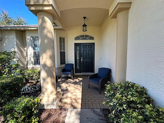 This Victoria III home sits on a large corner lot and has beautiful landscaping. Just inside the front door you are met with an open Foyer, a charming Bay Window providing plenty of natural daylight, Laminate flooring (new in 2022), and 10-foot ceilings. The home received a new Roof in 2023, and the HVAC was replaced in 2018. The open Dining Room is complete with a custom chandelier, and an opening into the Kitchen to assist in serving. The Kitchen boasts granite counters, stainless appliances, and nook area for that morning coffee or a quick lunch bite. There is also a gracious Family room just off the Kitchen allowing the food prep to be done while engaging in family activities. The main bedroom has double walk-ins, slider, and ceiling fan. The ensuite has dual sinks, a glass enclosed shower, and linen closet. Just on the other side of the home you will find a guest bedroom and bath, plus the third bedroom is being used as a den/office. The expanded Lanai is screened and has a ceiling fan to keep that air moving on warm days. The Laundry room includes a newer washer/dryer and shelving, with plenty of room for that task, and the garage has an elevated ceiling allowing more room for storage. Heritage Pines is a very active community with an 18-hole private golf course, lighted tennis/pickleball courts, Olympic size swimming pool and spa. The Clubhouse offers the best in dining and entertainment, plus crafts/clubs for every interest. This is a retirement lifestyle that is hard to beat!