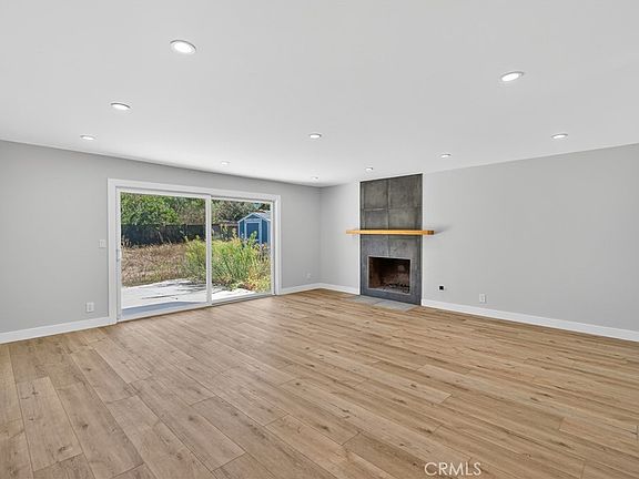 The fully renovated bathroom serves as a serene retreat, featuring a custom vanity, designer tile work, a new soaking tub, and contemporary lighting that evokes a spa like atmosphere. The kitchen is both beautiful and functional, showcasing shaker style soft close cabinetry, quartz countertops, and an oversized island with seating, ideal for both intimate meals and large gatherings. The open floor plan extends into the bright and inviting family room, complete with a cozy fireplace and sliding glass doors that lead to the backyard, creating a seamless indoor outdoor living experience.