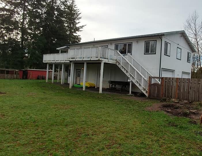 This home offers an incredible amount of space with a cozy atmosphere. There is 2383 sq. ft. of living space divided into 2 levels with 3 bedrooms, 3 bathrooms, 2 bonus rooms, a family room and living room, kitchen, as well as a common area and a garage with 2 bays. The upstairs has an open concept living room, kitchen and dining room area. Brand new carpet has been installed in the family room and common area just this week. The downstairs bathroom has been updated with new flooring, sink, vanity, toilet, etc… Numerous updates have been completed throughout the house. Outside you have over a half acre yard that is enclosed with a 6ft privacy fence with 2 separate animal pens located in the backyard. The partially covered wrap around deck is huge and offers tons of outdoor space to entertain and relax. There is also an enclosed garden area with strawberry and raspberry bushes planted and lots of room for you to add the plants you desire. All of this is within walking distance of Elma elementary school.