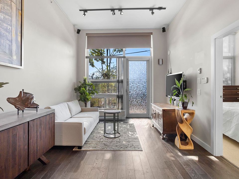 Spacious & beautifully designed 1 bed & Den+ bathroom home featuring a large, private patio—perfect for seamless indoor-outdoor living. Soaring ceilings and an open-concept layout create a bright, airy feel. This is 1 of 6 concrete-base units topped by 3 stories of wood-framed units. Full-size stainless steel appliances, quartz counters, custom flat-panel cabinetry with soft-close hardware, and wide-plank engineered oak hardwood flooring throughout. The bedroom has a large walk-in closet 2 parking stalls and storage. Quiet side of West 16th Street, just off Marine Drive, steps from shopping, dining, transit, & everyday conveniences. The Drive offers over 1,500 sq ft of premium amenities, a fully equipped fitness centre, resident lounge, multi-purpose room. *Open house 2-4PM Sunday Oct 19*