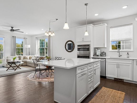 Professional landscapingSerene viewsCustom light fixturesOpen floor planSleek custom window treatmentsQuartz countertopsSparkling white kitchen