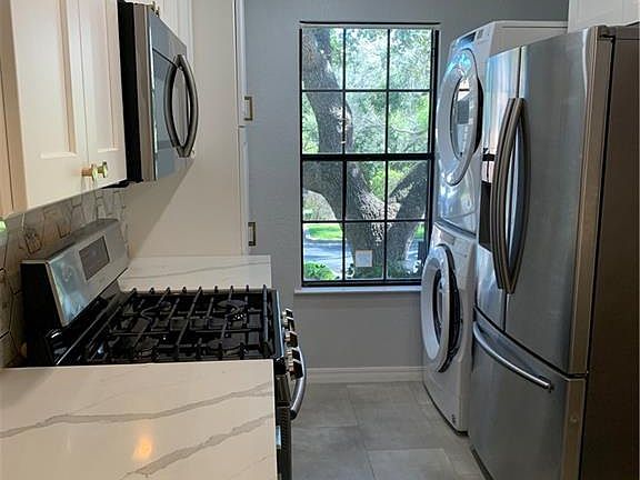 Highly customized condo with upgrades galore-- 2 primary bedrooms upstairs w/en-suite bathrooms; NO CARPET downstairs! Dining room open to kitchen w/breakfast bar; stainless steel appliances w/5 burner range; fridge, washer and dryer included; French Doors open to Private out door patio with a storage closet; Steps away from hike/bike trail; Easy access to shopping, Q2 Soccer Stadium, major highways, ACC, Domain & public transit. Condo has a community pool for warm summer days. 2 assigned parking spots