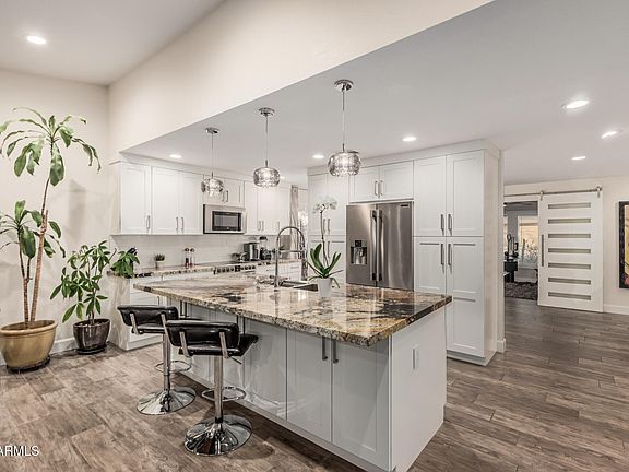 The backyard is designed for year-round enjoyment, with a remodeled pool featuring a baja step, paver patio, and custom landscaping. A true standout, this home was honored with the 2018 Ahwatukee Pride Award and featured in Ahwatukee News. With the quality, finishes, and custom details typically reserved for much higher price points, this is a rare opportunity. Parking includes a 2-car garage, expanded driveway, and RV gate with side yard Neutral paint, abundant natural light, elegant light fixtures, and contemporary wood-look tile flooring further enhance the house's inviting atmosphere. The primary bedroom is a haven of tranquility, complete with access to the backyard, a generous walk-in closet including built-ins, and an ensuite with dual sinks & a tile step-in shower. Large laundry room with attached sink & cabinetry for added convenience. Discover the fantastic backyard that serves as an entertainer's paradise! The lush landscape is dotted with palm trees and mature plants, interspersed with natural grass. A full-length covered patio is for a shaded retreat, while the sparkling pool invites relaxation and fun. Pavers add a touch of sophistication, creating an irresistible outdoor living space. You'll LOVE this place!