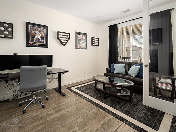 Gorgeous Balfanz home in Belcourt Seven Oaks in impeccable condition boasting custom upgrades throughout. This split-wing home has 3 beds, 2.5 baths and an office w/ French doors. The modern kitchen is a chef's dream w/ upgraded appliances, walk-in pantry, soft closing white cabinets and quartz counters w/ an extended island. Open concept floor plan w/ beautiful wood look tile floors and double-sided fireplace is perfect for entertaining. Features custom paint, shutters, ample storage, sprinklers, and lots of natural light. Oversized master bedroom w/ ensuite contains separate shower/tub, double vanity and large walk-in closet. Enjoy the serene backyard w/ its extended covered patio, landscaping, and private white block wall. Spacious 3 car garage is impressively finished. Home has lovely curb appeal on a cul-de-sac. Perfectly located for short walks to the community center, pool, gym, tennis, parks, restaurants and more. Move-in ready! Seller offering 1% toward Buyer's Closing Costs