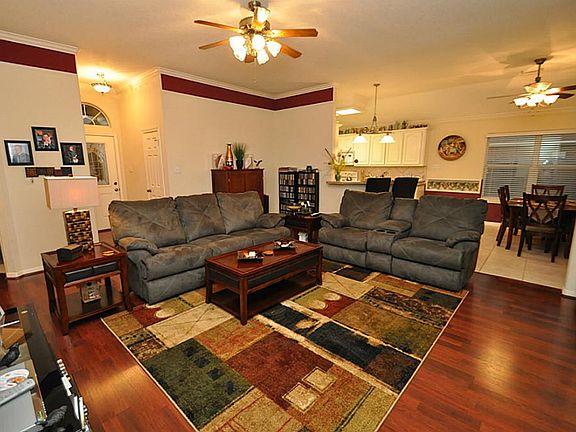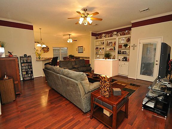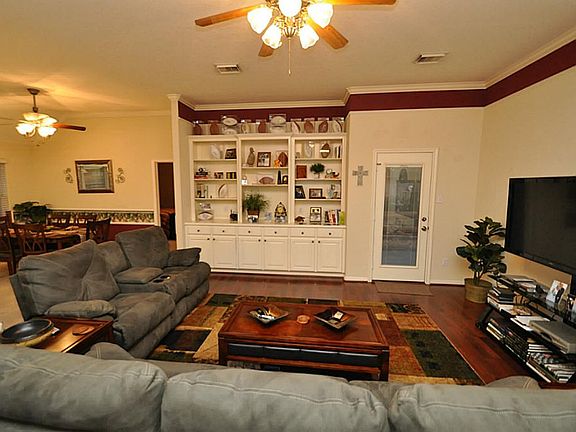 Beautiful Bilmar Home 3/2/2 in the established neighborhood of Santa Fe Trails! Open and split floorplan*16 seer A/C , 10x10 storage shed/workshop*Covered back patio with concrete brick extensions*Kitchen has plenty of cabinet and counter space with convenient breakfast bar*Washer, Dryer and Refrigerator stay*Dark laminate wood floors in the living room*Built-ins*Master bath with his and her closets and sinks*Garden tub and stand up shower w/bench!