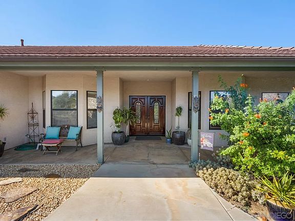 Soak in the beauty that surrounds this remarkable property! Nestled on an expansive 2.77-acre lot in the highly desirable neighborhood of Eucalyptus Hills. This property captures breathtaking 180-degree views of the mountains & hillsides. As you step inside, you'll be greeted by the warmth of three custom fireplaces & the elegance of vaulted ceilings throughout. Entertain with style in the custom pub-like bar featuring granite countertops & a custom wine rack. The kitchen is open to the entertaining spaces, with a center island, oak cabinetry, pantry & granite countertops. The spacious primary bedroom has french doors leading to a patio, a fireplace, a large en suite bathroom, & several closets. Throughout the home, oversized picture windows were strategically designed to maximize those stunning views. Multiple outdoor entertainment spaces, including a large covered deck with eastern mountain vistas, a shaded back patio, side patio, & lawn offer multiple spaces to enjoy. Outside, you'll find a fully fenced yard, an electronic gated driveway entrance, mature landscaping, & ample space for all of your hobbies, RV/boat/trailer, critters, & more! As a HUGE bonus, this property has a separate road access to the lower lot. A perfect potential space for an ADU, barn or? Don't miss your chance to call this oasis your home!