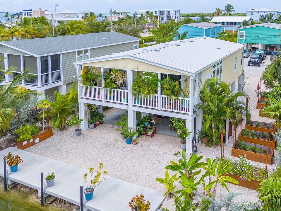 Beautiful waterfront home and garden paradise that's move in ready! Quick and easy boat access to open water. Nestled in the desirable Cutthroat Harbor Estates, this 3 bedroom home features an open floor plan with plenty of natural light, offering room to entertain or just relax. The lovely kitchen boasts plenty of cabinet space, an eat-in island, stainless steel appliances, quartz countertops, and an extra large capacity double door refrigerator and freezer. Step outside through the large sliding glass doors to a covered porch overlooking the canal and the concrete dock. Additional highlights include a sizable laundry room with shelving and extra storage. Downstairs, a storage enclosure provides ample space for fishing gear, bicycles, and all your extras. The yard features a professional quality irrigation system serving eight raised beds and trees on both sides of the property. Located in a quiet neighborhood, this home is close to local restaurants and just a short drive to the historic Key West.